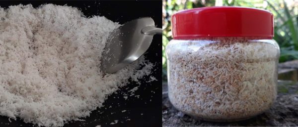 在新村,有的人会把这些椰丝再用小火炒过,前后大概10分钟。将椰丝从白色炒到稍微变黄就熄火,马上取出。不然,锅中余温会让之变焦。之后,加上适量白糖或黄糖拌匀,便是脆口又带有微甜的零食。