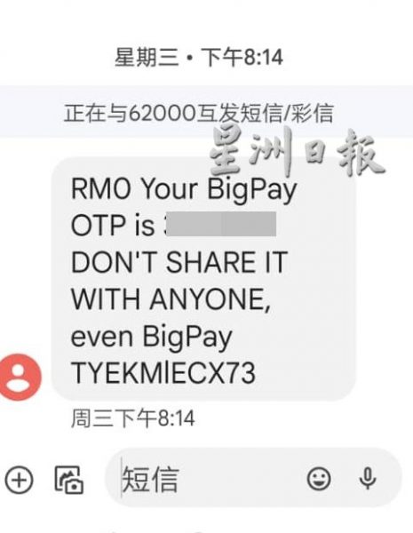 美里一名男子于1月26日收到一则来自BigPay一次性密码的手机短讯,因他没使用有关支付平台,因此没有理会。
