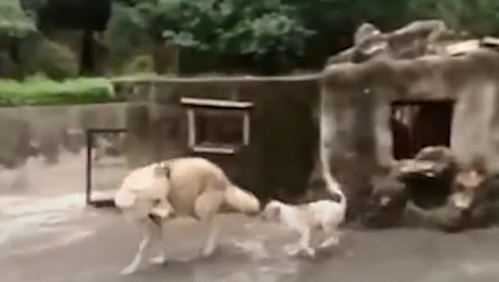 据工作人员介绍,该只中华田园犬是母狗,当时只有2岁,“它们吃住玩都在一起,共同生活相处已经5年时间,公狼不仅没有撕咬母狗,相处还非常好。”