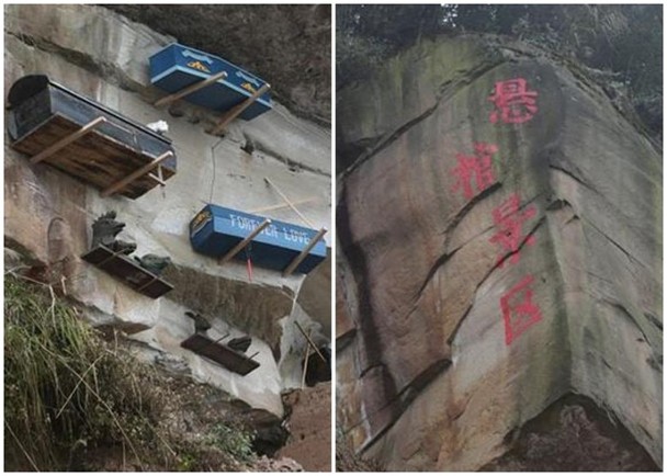 据中国媒体报道,该男子上周四(3日)下午与友人驾车经过一个村落附近的山区公路时,无意中发现途经的山崖壁上挂着几副棺材,棺材下方有木头作为支撑,而其旁边还摆有动物雕像,他顿时被这一景象吓到,更称“晚上感觉会更吓人”。