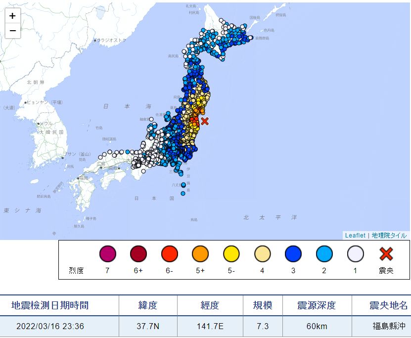 日本气象厅表示,地震震央位于福岛外海,地震规模7.3级,深度60公里,宫城、福岛最大震度6级,岩手、山形、青森、秋田、茨城等县市最大震度5级。