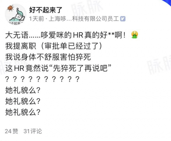 该员工称是与制作人商量过后,并已获批准,过两天检查身体后再上班,并补充“猝死,你负责?”。公司人事部同事回了一句“猝死了再说吧。”当事人气得公开对话截图。