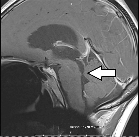 脑干和小脑之间的下水道狭窄,脑脊髓液的循环受阻(箭头处)。