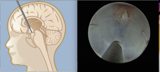 我告诉她说,脑积水的治疗方式主要有两种,第一种是脑室腹腔引流术(VP shunt),第二种是微创脑室造口术(Endoscopic third ventriculostomy),龙妈妈考虑了一下,选择了第二种治疗方式。