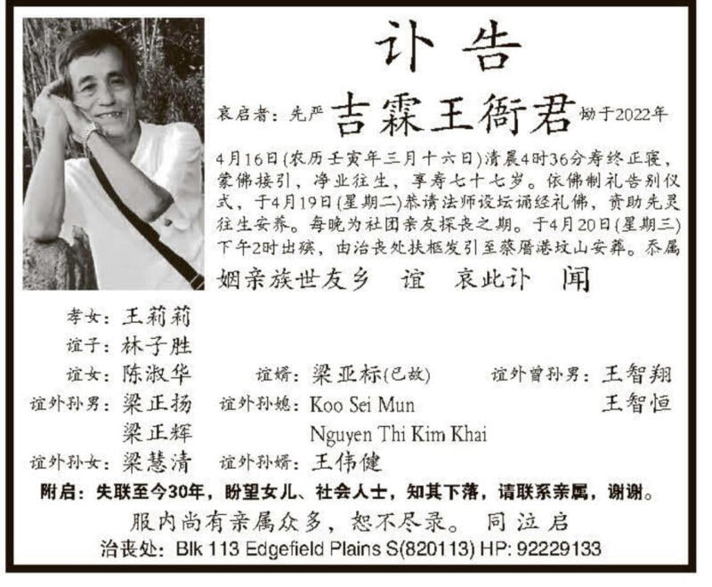 陈淑华今早(17日)受访时表示,此前也曾帮干爹在网上寻人,因此这次也特别在讣告上注明,希望社会人士协助让失联20多年的女儿联系亲属。