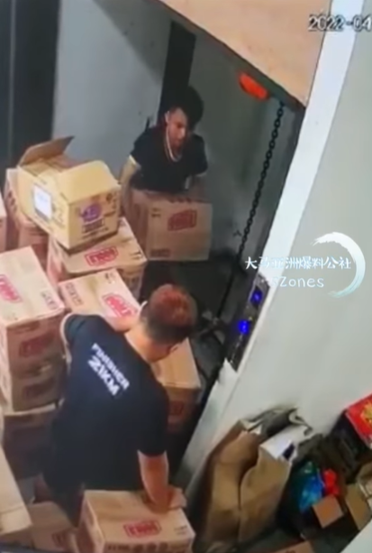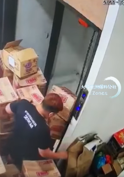 超市监控画面显示,数箱货物突然倒在降落中的电梯顶部,导致电梯无法继续运作。死者和一名同事见状,便上前查看,前者也决定冒险走入电梯顶部搬出货物。