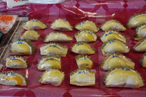 目前已踏入榴梿季初期,各品种榴梿陆续流入市面,A级金枕头榴梿售价180铢/公斤(约22令吉);B级售价160铢/公斤(约20令吉);差尼榴梿售价120铢/公斤(约15令吉);托曼尼榴梿售价100铢/公斤(约12令吉)。