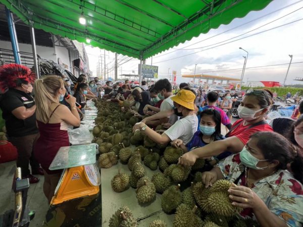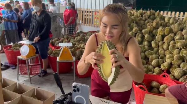 榴梿分拣厂女老板指出,近日她在直播拍卖榴梿,没想到人气超级旺,每个榴梿竟然最高拍卖到2000铢(约250令吉),利润非常高,所以决定把其中一部分利润回馈给社会,让更多的普通百姓能够吃到榴梿,没想到一开始拿出的3000个卖相不是很好的榴梿开卖后,不到30分钟就被抢购一空。(泰国世界日报)