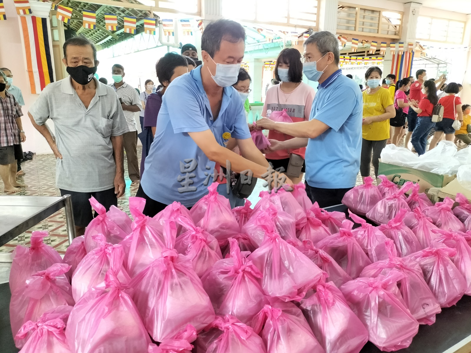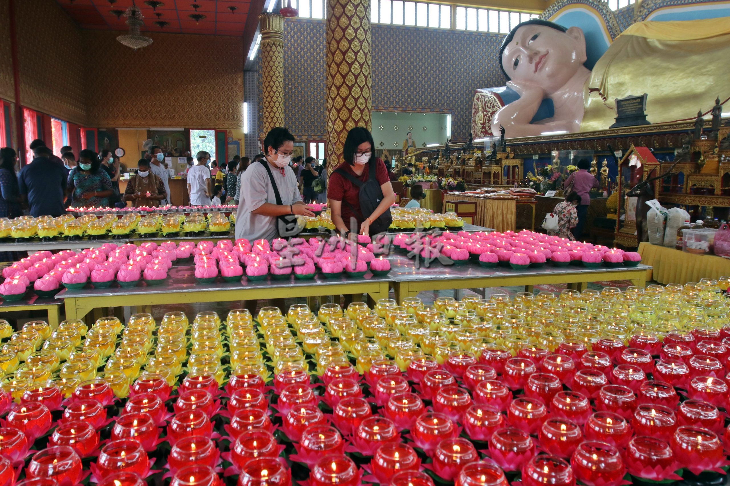 过去卫塞节当日,佛学院也允许善信膜拜后前往食堂,一同享用义工烹煮的素食。但为了避免人潮聚集,该院今年改以把素食包装起来,免费分派给善信。