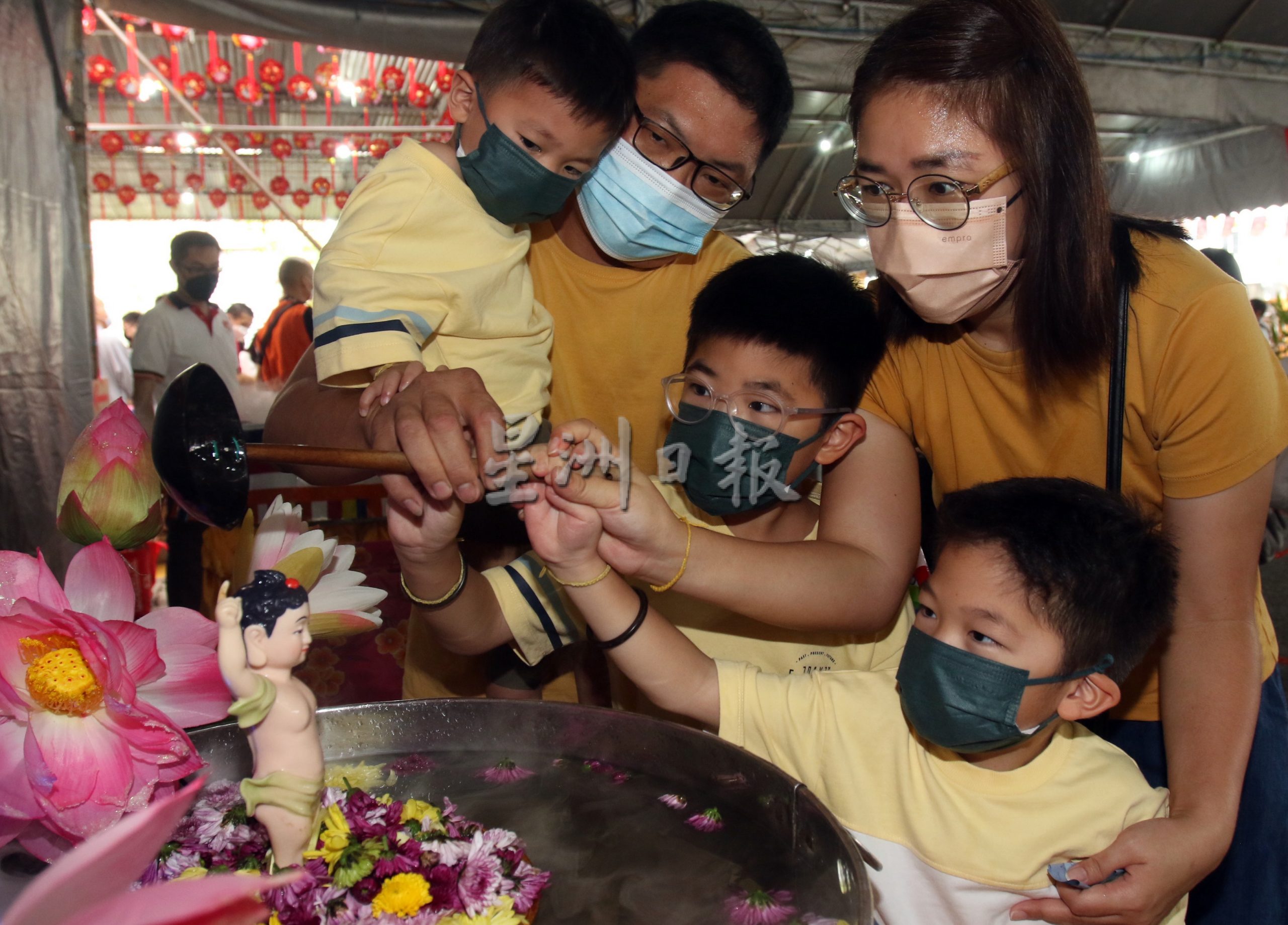 陈蕙莲说,行管时期的卫塞节,他们只可在家庆祝,今年终于恢复实体活动时,她和丈夫也带着孩子前来,教导孩子浴佛,从中认识佛教。