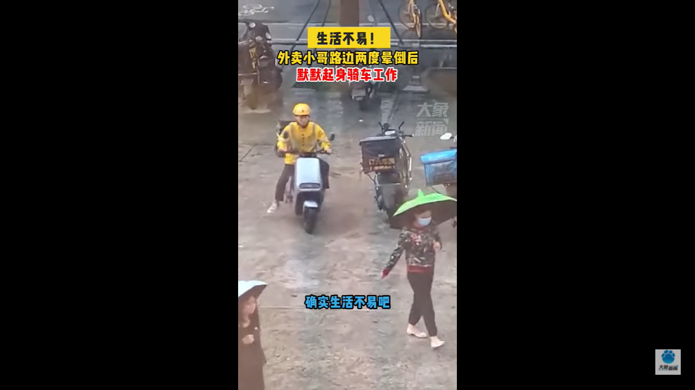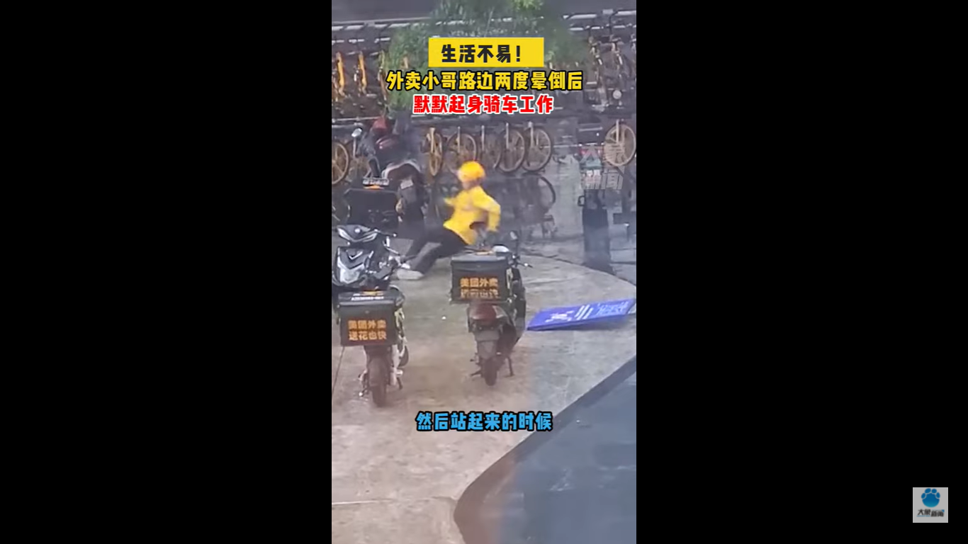 视频 | 雨中两度晕倒跌地!送餐员默默起身工作