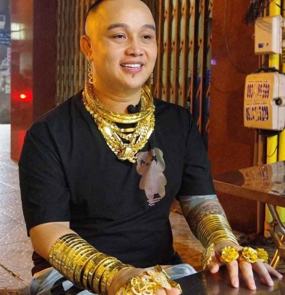 Thuan每次外出散步或工作时,都会佩戴10枚戒指、30条手链和12条或以上金链,整个人看起来金光闪闪,非常耀眼。