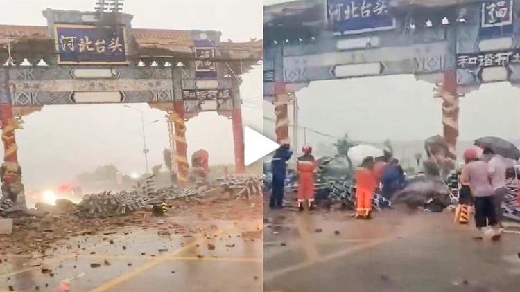中国河北省石家庄市鹿泉区上周六傍晚突发极端大风暴雨天气,上庄镇台头村村北牌楼顶冠(钢筋水泥材质)从12公尺高处坠落,当场砸中正在底下避雨的9名民众。