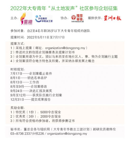 董总这次主办的“从土地发声”社区参与企划案征集活动,将目标锁定35岁以下的大专青年。陈亚才说,这是因为大专青年对未来总有很多想像,“我们希望大专生从社区作为一个起点,去落实他的理想和家国情怀。”
