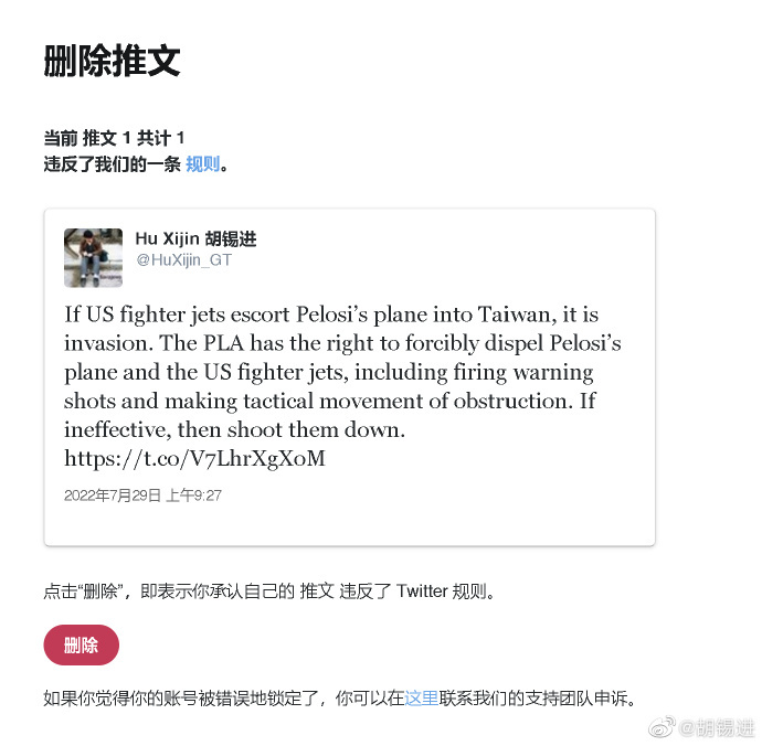 胡锡进说,周六上午发现他的推特帐号被锁住了。推特说是他发的这则推文违反规则,必须删除。“有什么办法,人在屋簷下,不得不低头。我只好点击删除,给自己的推特帐号解锁。”