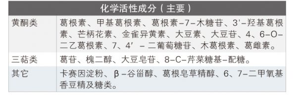 《中华药典》归类为解表药(发散风热),葛根的化学活性成分含葛根含黄酮、三萜、生物碱、皂素和糖类。