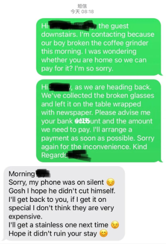 “我赶紧联系房东(打算)赔钱给人家,但是是周天才8点多,担心人家在睡觉,就发了短信,把碎玻璃收拾干净。”