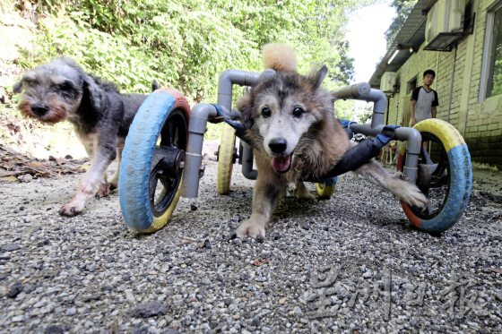 庇护所里有不少残障毛孩,唐绣莲都为它们订制轮椅,每天定时给它们放风。