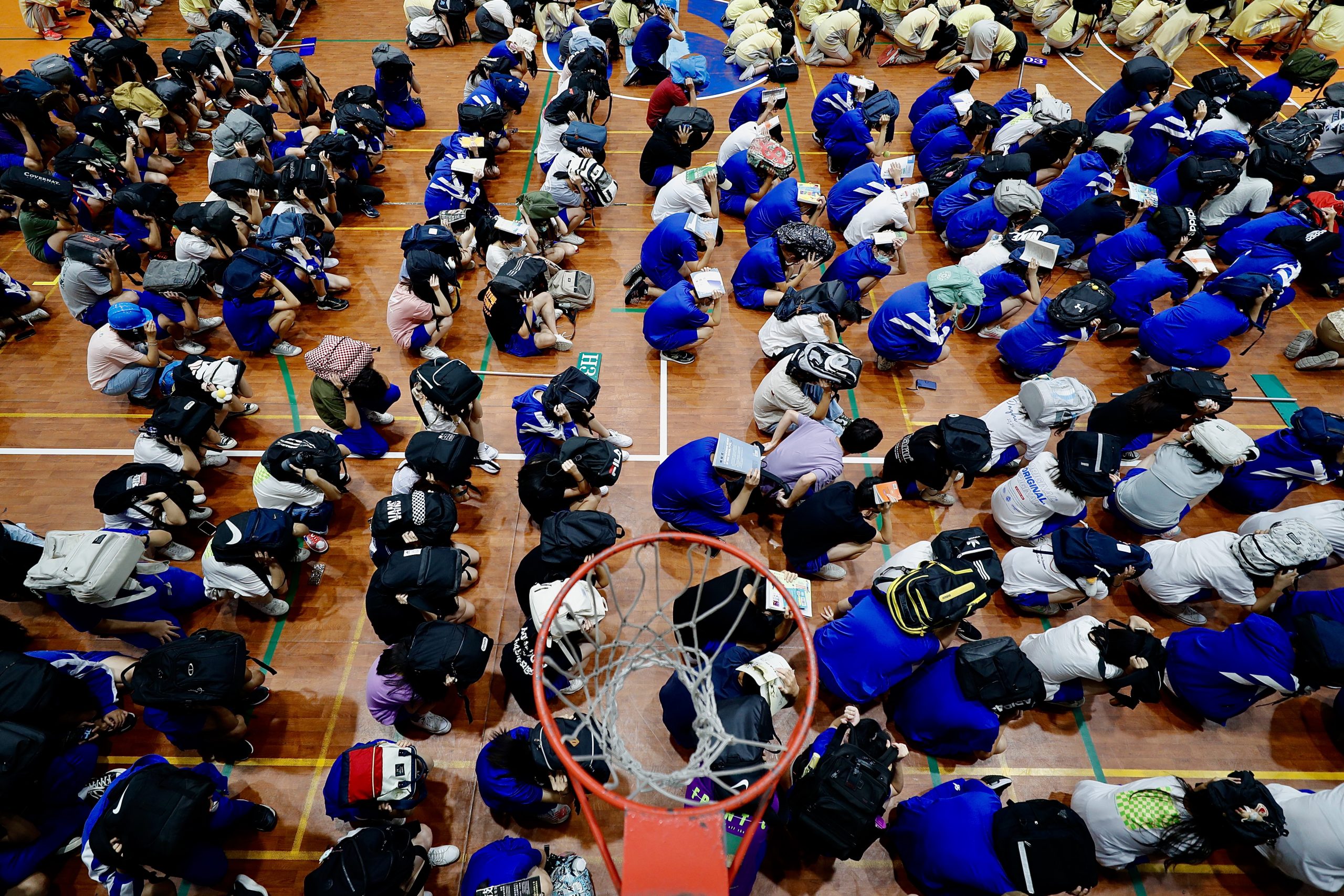 (台北21日综合电)台湾台北市大直高中周三举行防灾日防空及震灾复合式灾害疏散避难演练,学生在警报声响后,迅速前往安全避难地点集合,并以书包保护头部和颈部。