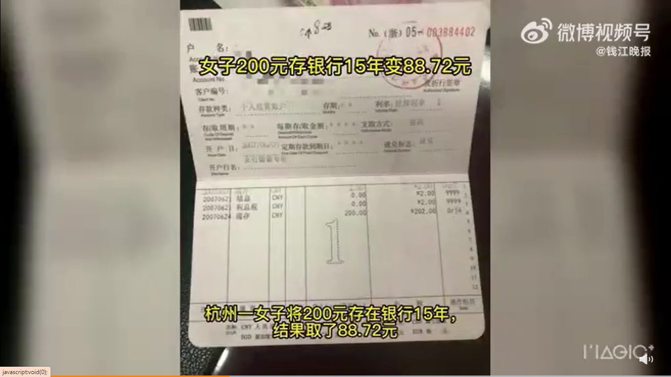 中国杭州一名女子将202元(约133令吉)存在银行15年,最后只剩下88.72元(约58.56令吉),引发热议。