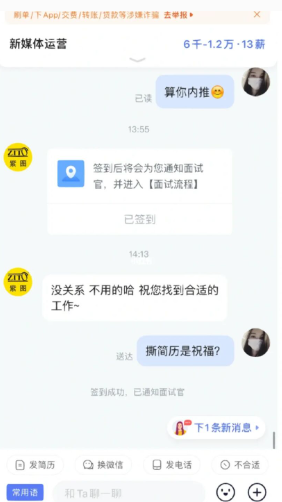 她说,该出版社的人事部上月25日联系她,但她已表明自己换工作意愿不强,因为她只是刚转岗不习惯,所以才会随手点开求职软件,双方最终定于本月7日面试。