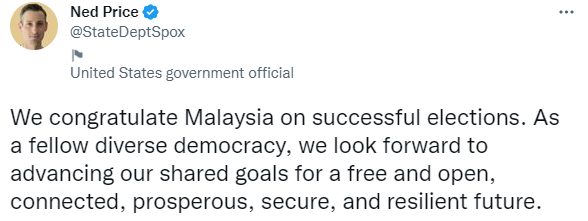 We congratulate Malaysia on successful elections. As a fellow diverse democracy, we look forward to advancing our shared goals for a free and open, connected, prosperous, secure, and resilient future. https://t.co/RMrQmUf9Qn