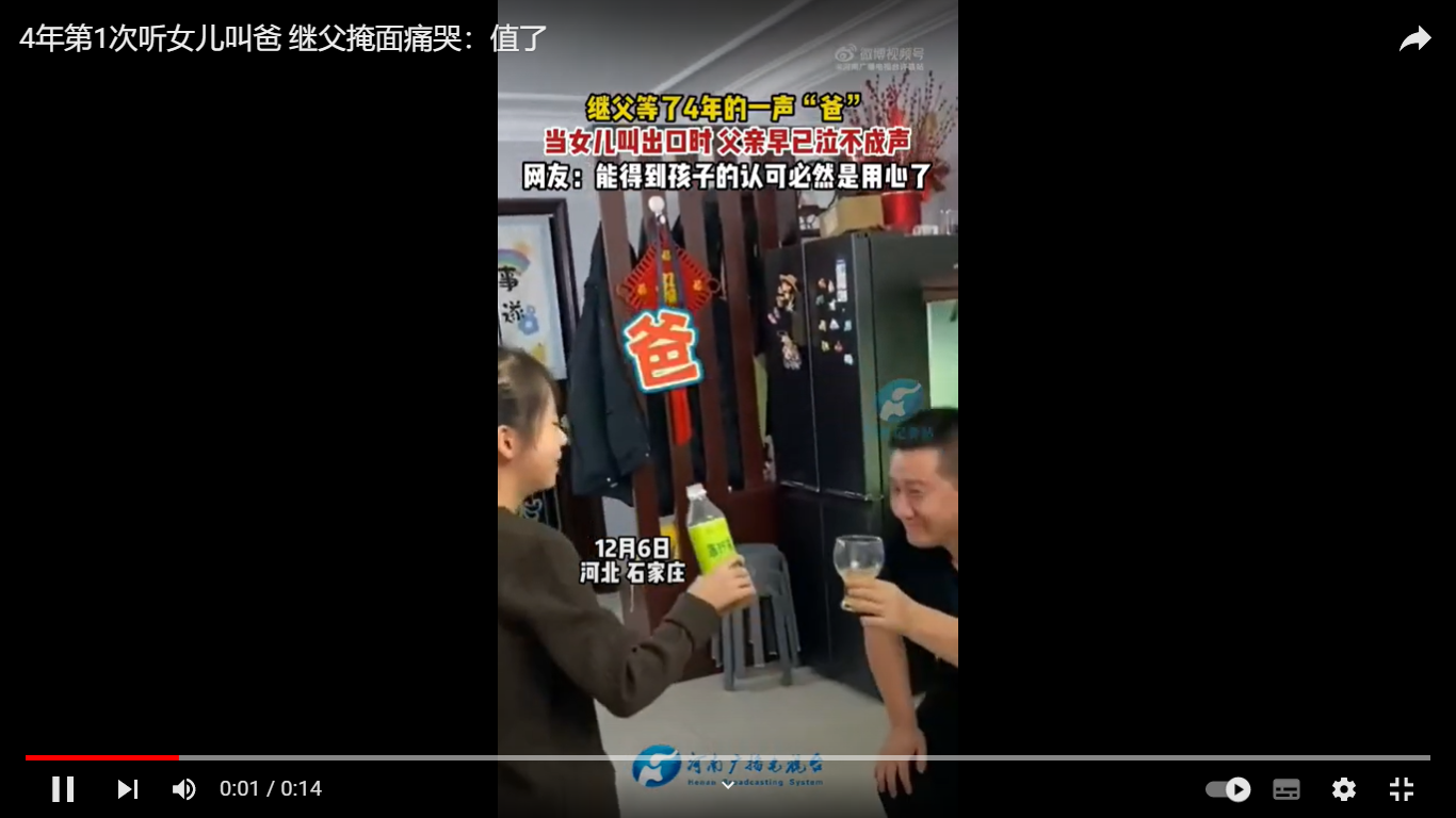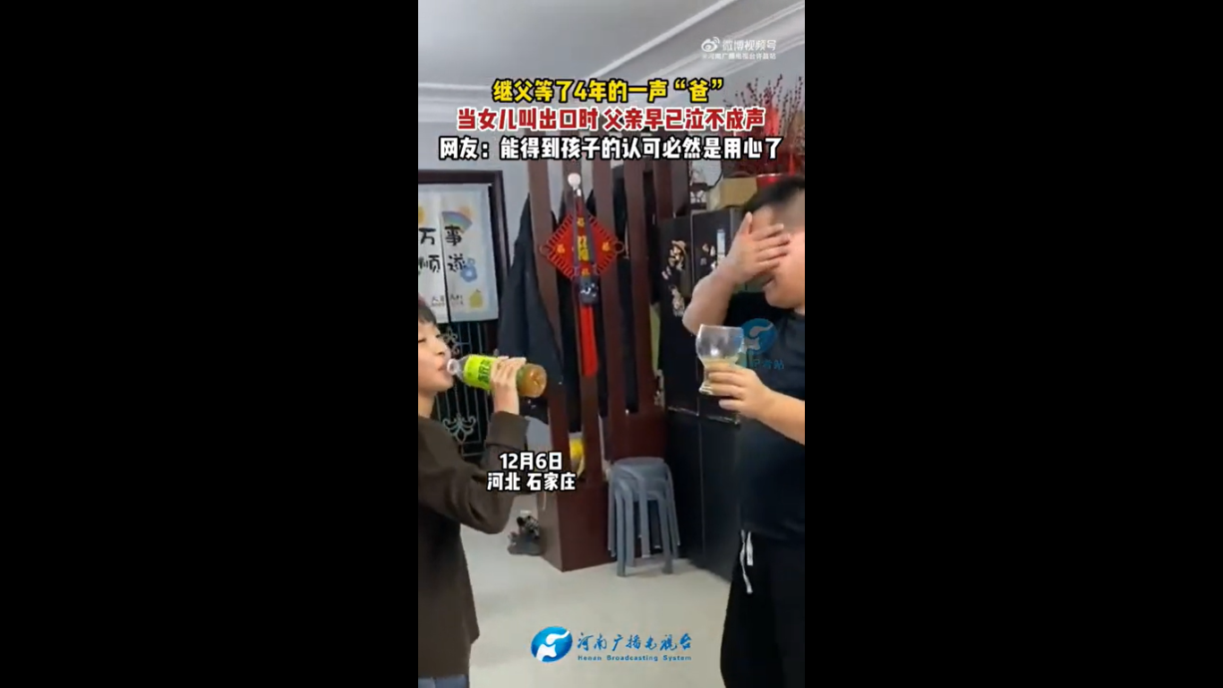 中国河北石家庄一名男子和育有一名女儿的女子结婚,婚后4年内尽心尽力对家庭付出,也对毫无血缘关系的继女视如己出,但继女始终还没打从心底接受他,不曾叫他一声“爸爸”。