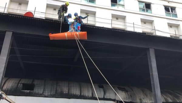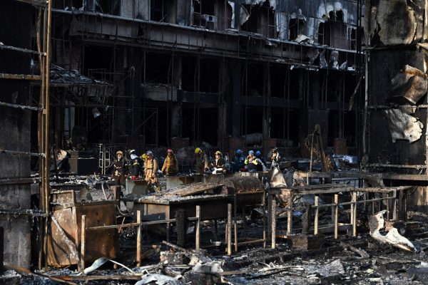 搜救人员周五上午7时(大马时间8时)重新进入被烧毁的建筑时,现场偶尔冒出黑烟。