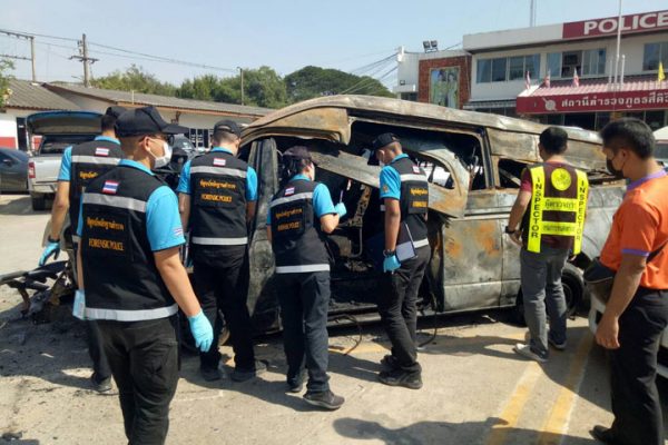 载客客货车失控衝撞栏杆失火事故最新进展,此次事故发生在呵叻府四球县友谊路进入曼谷辖区内的一侧,最终火势蔓延至整辆客货车,导致11人死亡、仅有1位倖存者。