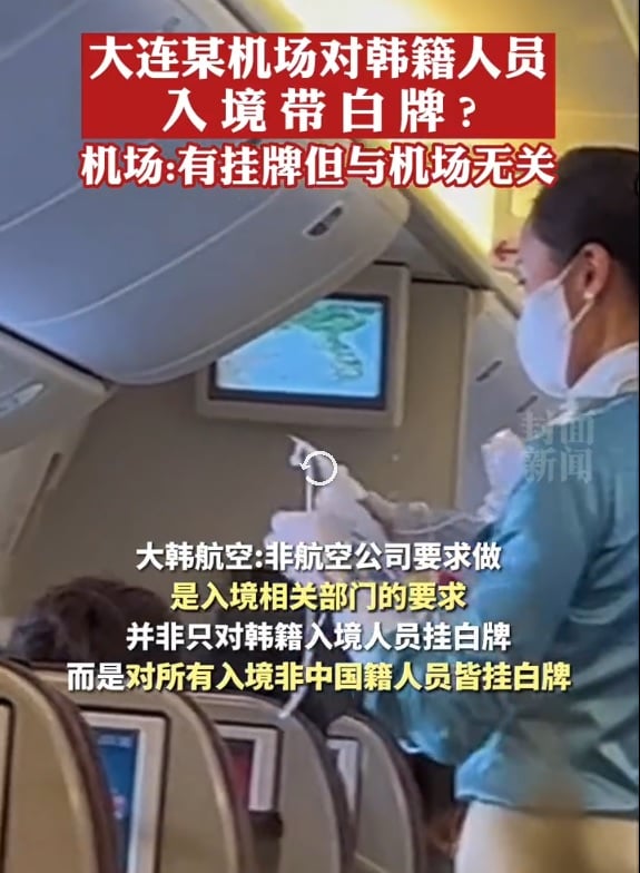 中媒封面新闻周三晚报导,有网友3日在某平台发布影片爆料,称“大连周水子国际机场对韩国人入境带牌”。影片显示,当飞机快要落地时,空服员给韩籍人员发放了白牌,要求他们举著白牌,并告知韩籍人员走单独通道去做冠病核酸检测。
