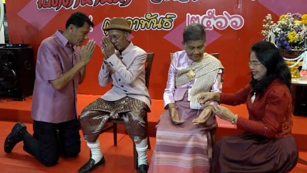 (曼谷16日讯)在情人节之际,77岁新郎带着队伍浩浩荡荡来到74岁新娘家中,求娶与自己生活了55年的新娘,两人育有4个孩子,夫妻俩一直甜蜜恩爱,孩子们也各自有了家庭,他们唯独缺了一场正式的婚礼,这个情人节正好弥补了这个缺憾。