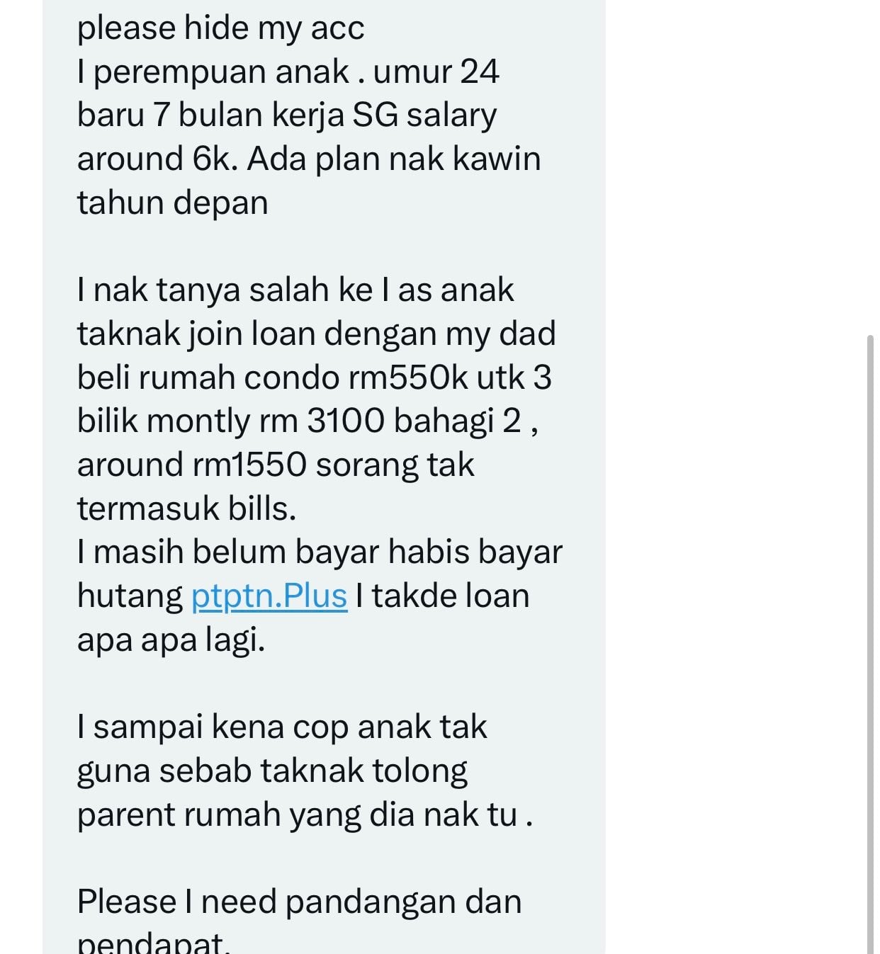 “我想问,作为一名孩子,我拒绝和父亲联名贷款,购买一间价值55万令吉的三房共管公寓,有错吗?”