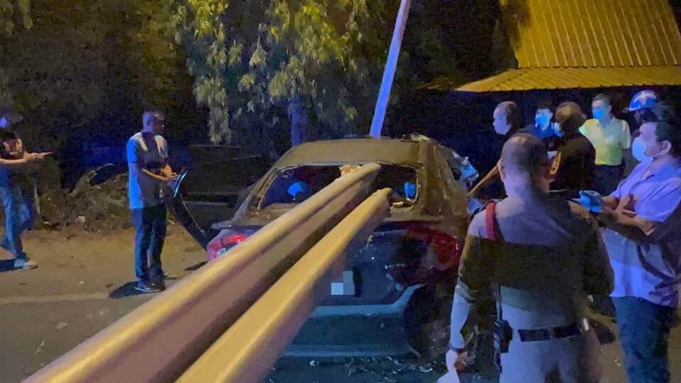 据泰国媒体报道,事故发生于20日凌晨12点15分,死者下班后开快车回家,到猜纳府Wat Laem Wa学校前的Phahonyothin路段时试图超车,却因为车速太快,导致车辆失控撞向道路左侧护栏,导致10公尺长铁栏穿车而出,而轿车在路上打转了几圈后,直到撞到附近电线杆后才停下。