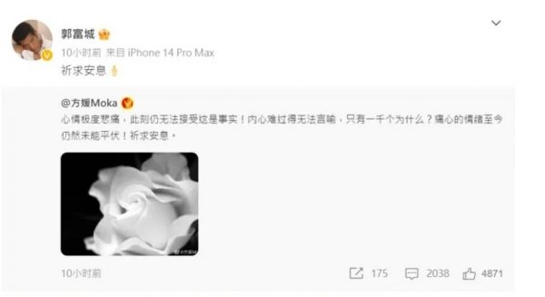 方媛周日稍晚终于在微博回应好友离世,发文说:“心情极度悲痛,此刻仍无法接受这是事实!内心难过得无法言喻,只有一千个为什么?痛心的情绪至今仍然末能平伏!祈求安息。”郭富城随後也转发该则贴文,以4个字“祈求安息”悼念好友。