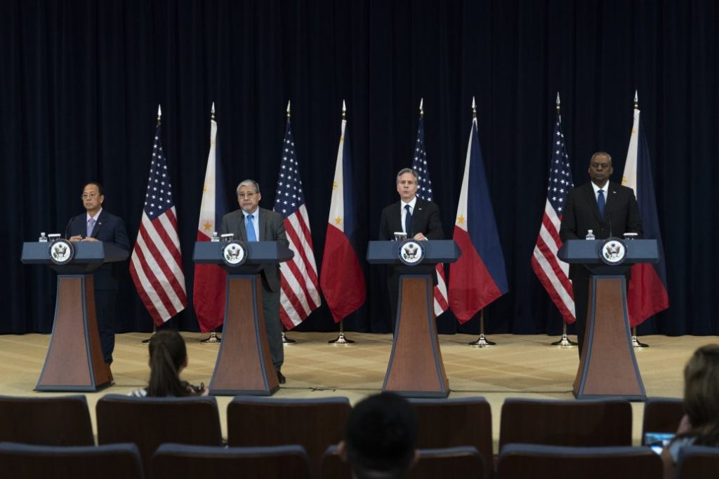 美国国务卿布林肯和防长奥斯汀,联同菲律宾外长马纳洛和代理防长加尔维斯在华盛顿举行美菲“2+2”双边会谈。