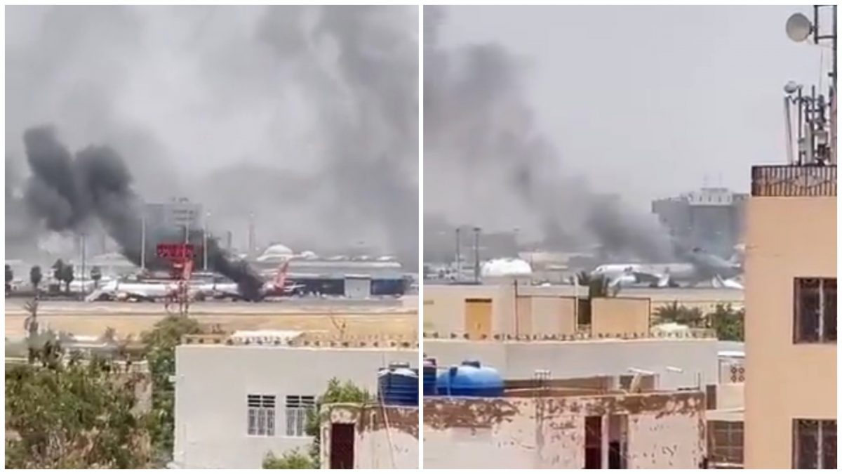 根据网络上流传的影片,苏丹首都喀土穆国际机场陷入混乱,停机坪上有飞机着火冒起浓烟。