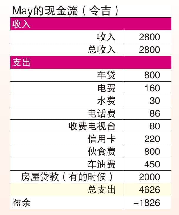 现有资料上有提起房屋贷款,但May没有提及是否单身或结婚,如果是单身或小家庭,可以考虑出租屋子,然后选择和家人一起住,除了有家人照应,也可以得到伙食的支援。这样你的收入就会增加很多。