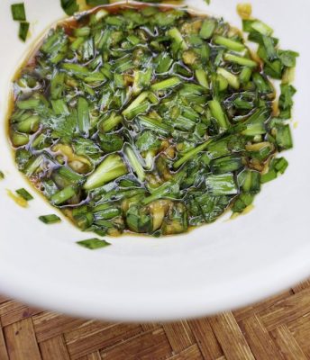 韭菜一把切细段、盐1茶匙、糖2茶匙、酱油2汤匙、开水1汤匙、姜末1汤匙、蒜末1汤匙。