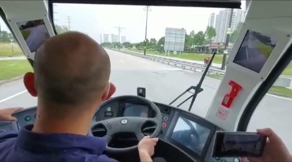 在智轨电车的司机座,左右上方各有一个屏幕作为侧镜,可以看到车身两旁的路面情况。