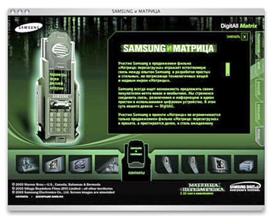 这款是三星与电影《Matrix》(骇客帝国)设计团队合作开发的创新手机,其设计类似《The Matrix Reloaded》中使用的手机,2003年配合这部电影上映时期问世,但并非供日常使用的主流手机,算是较高品质的电影周边产品。