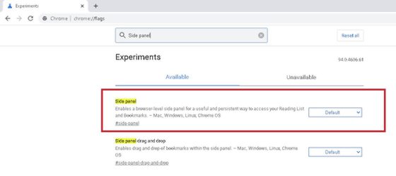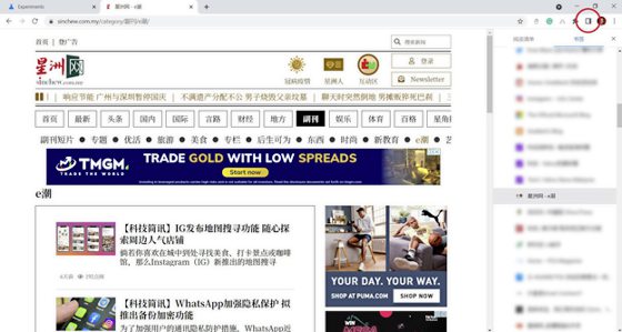说到侧边栏,谷歌Chrome浏览器早前已有显示“书签”和“阅读列表”的侧边栏功能,但用户必须手动开启有关功能。首先输入chrome://flags,接着搜索“Side Panel”和点击“Enabled”。刷新页面之后,在右上角会看到侧边栏的图标。