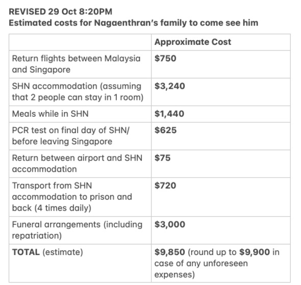根据她公布的预算,家属到新加坡的开销预计为9900新元(约3万零480令吉),这包括来回机票、隔离住宿及三餐费用、冠病检测费、交通费及纳加德蓝被行刑后,3000令吉的丧礼费。