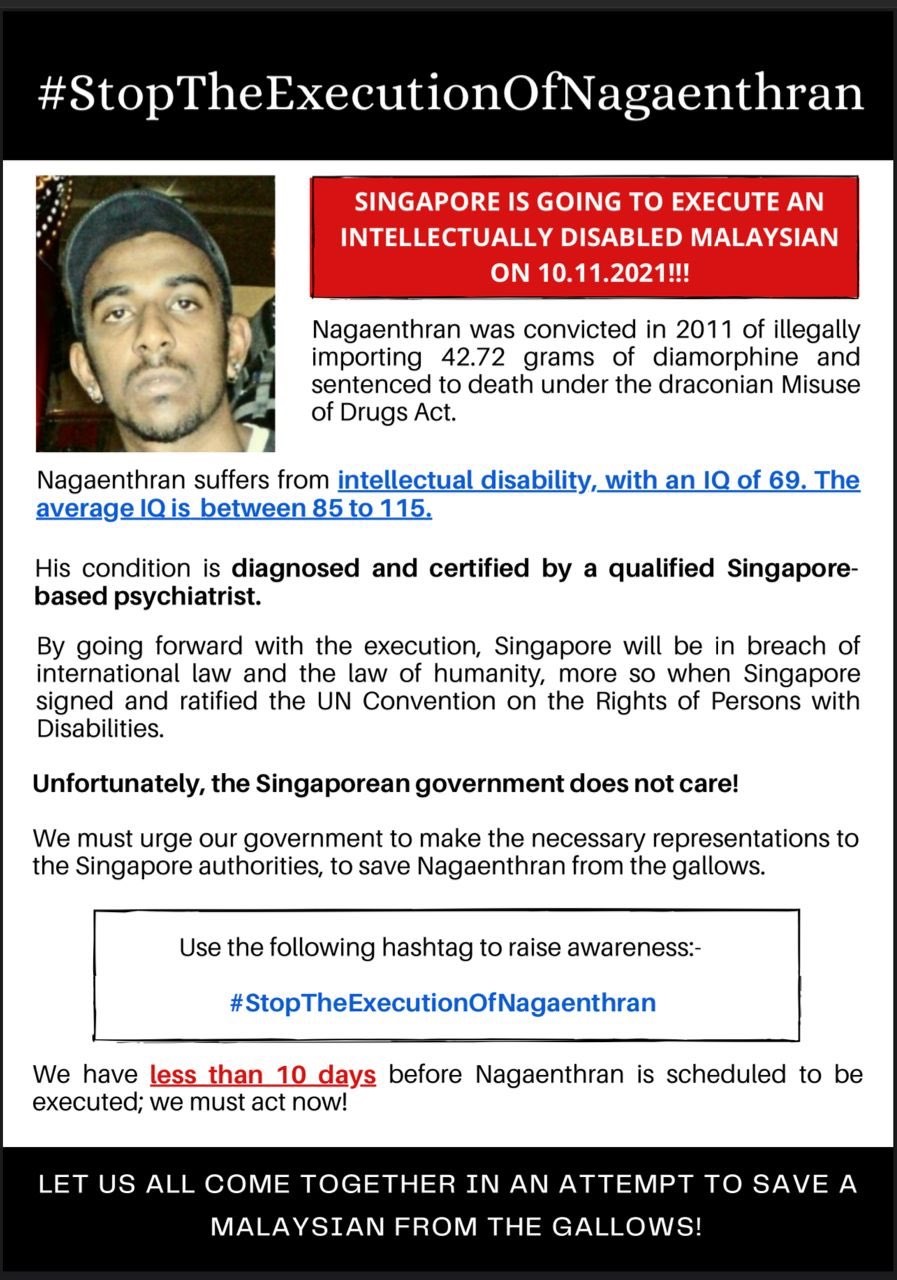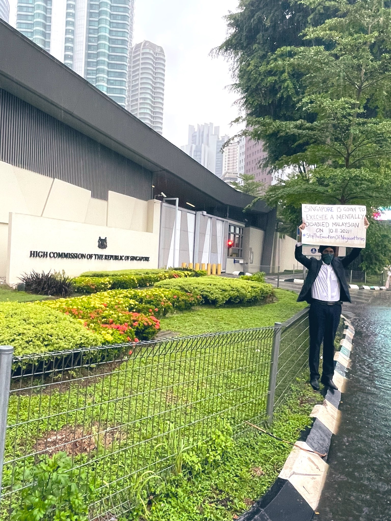 With 9 days to go, I once again stood infront of the High Commission of The Republic of Singapore, in an attempt to raise awareness and with the hopes that our Gov will intervene. I was accompanied by Ms. Reenajit Kaur Golen – a brave young soul!#StopTheExecutionOfNagaenthran pic.twitter.com/DJcK8orfK4