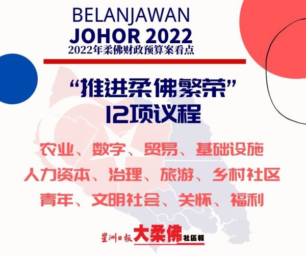 (依斯干达公主城18日讯)柔佛州政府在2022年财政预算案拟定了12项议程,以配合4项新经济动力推动及强化柔州的经济、社会、福利等,冀望通过各项拨款支援,协助州经济从冠病疫情的“创伤”中走出来。