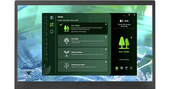 虽说是环保笔电,但性能一点也不赖。Aspire Vero一共有两种规格配置,用户可以选择第11代Intel Core i5-1155G7或i7-1195G7处理器。无论选哪一个,笔电都会搭载Intel Iris Xe显卡。如果用户选择i7处理器,将会搭配16GB LPDDR4X的运存以及512GB PCIe NVMe SSD的储存空间。这款笔电也内建了最新的VeroSense节能系统,Acer为用户提供4种性能模式,分别为Eco、Eco+、Balanced和Performance,可以有效地节能和保护电池寿命。