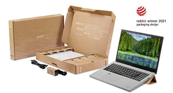 当然,外盒包装也不例外,有80%至85%是使用再生纸浆制成,能够100%回收和重复利用。Acer还将电源转接器的塑料保护套变成纸套,Aspire Vero的笔电包和键盘保护膜也是用100%工业再循环塑料制成。