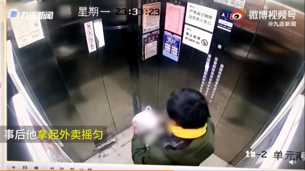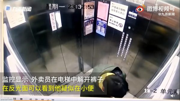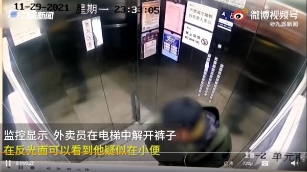 此事发生于上月29日,监控画面显示该送餐员待电梯关门后,疑似解开裤链,朝外卖盒子小解,事后还拿起外卖摇晃均匀。