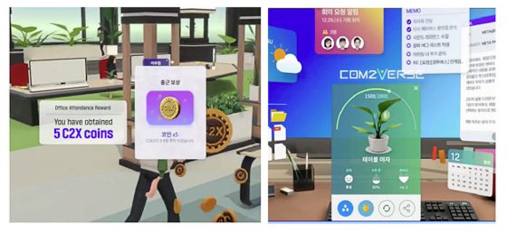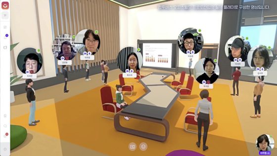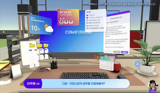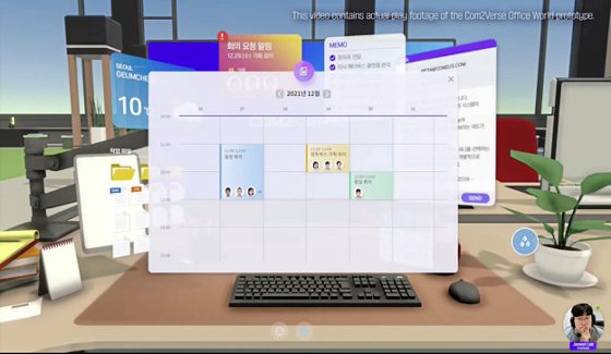从视频里面可以看到,只要用户靠近另一个用户的“分身”,便会自动开启视频谈话,这有点类似【e潮】去年所报道的视讯社交平台Gather Town。在“Com2Verse”里面,用户可以自由走动。当用户回到办公桌,“坐”下来时可以点阅今天的工作清单、使用日历管理行程。如同现实世界,用户需要走到会议室才能进行多人视讯会议、观看同事所做的PowerPoint演示。