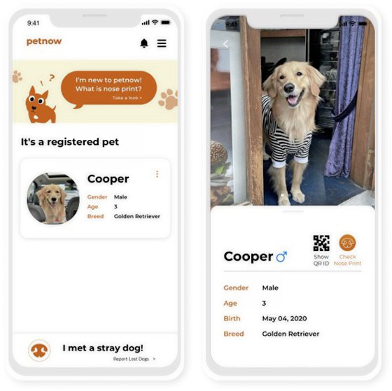 以往是为宠物套上项圈或在皮下植入电子晶片,但这样会对宠物造成心理伤害。反观鼻纹识别技术是一种无痛和无副作用的身分认证方式,只要一个应用程式便能轻松搞定。为了让用户顺利拍下宠物鼻纹,Petnow应用程式能自动对焦、检测和拍摄照片。只需把摄像镜头对准狗鼻,系统就会自动捕捉和拍摄,而用户无需按下快门。