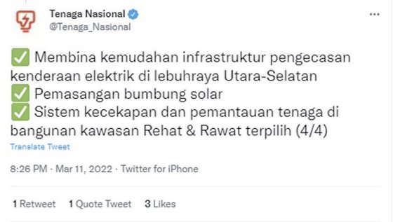 国家能源和南北大道有限公司(PLUS)日前也签署合作备忘录,将会在南北大道建设电动车充电站。从柔佛北上槟城的电动车车主可以安心驾驶,不必担心汽车电力不足。不过,双方没有透露何时开始实施这个项目,电动车车主可要留意官方的最新文告。